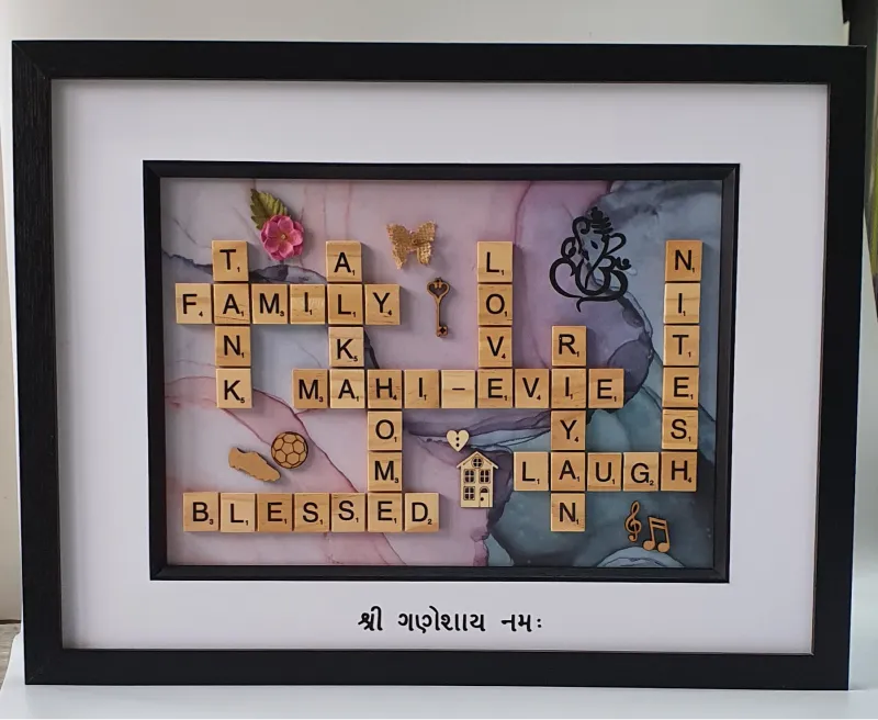 Using the names and words given to us, a unique layout is created in scrabble format and displayed on a background of choice. The wooden embellishments used, are a very special element as they represent a story, hobbies and/or interests.